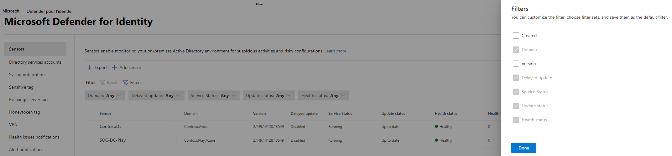 Afficher les paramètres et les status du capteur Defender pour Identity