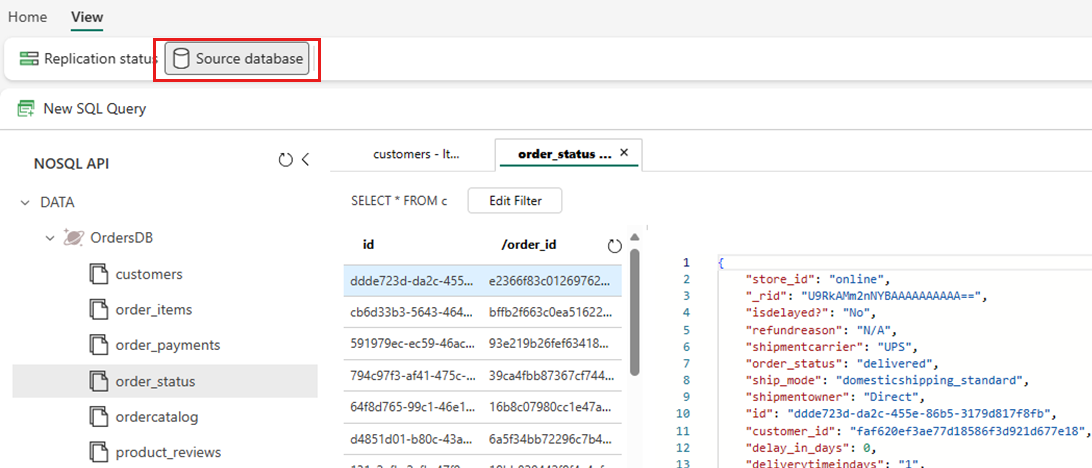 Sélectionnez Affichage, puis base de données source. Cette action ouvre l’Explorateur de données Azure Cosmos DB avec une vue en lecture seule de la base de données source.
