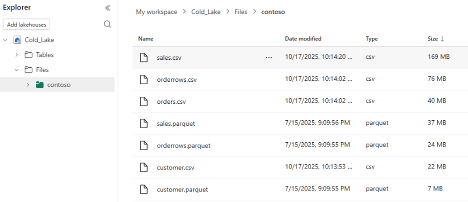 Les exemples de scripts suivants utilisent un Fabric Lakehouse nommé Cold_Lake qui héberge le magasin Contoso et les données client dans des fichiers Parquet et csv.