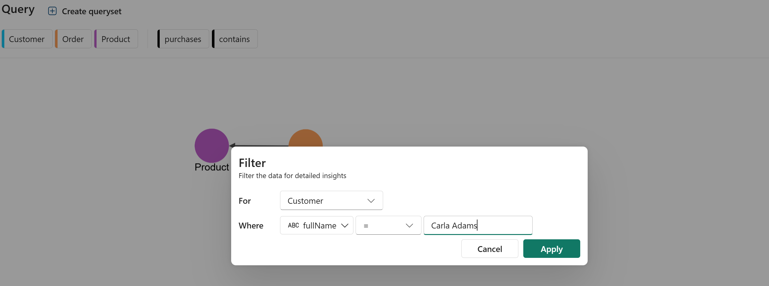 Créez une requête pour répondre à la question : « Quels produits un client spécifique a-t-il achetés ? » Cette requête traverse le graphe en partant du Client, passant par la Commande, jusqu'au Produit. Par exemple, pour interroger les achats du client Carla Adams, procédez comme suit :