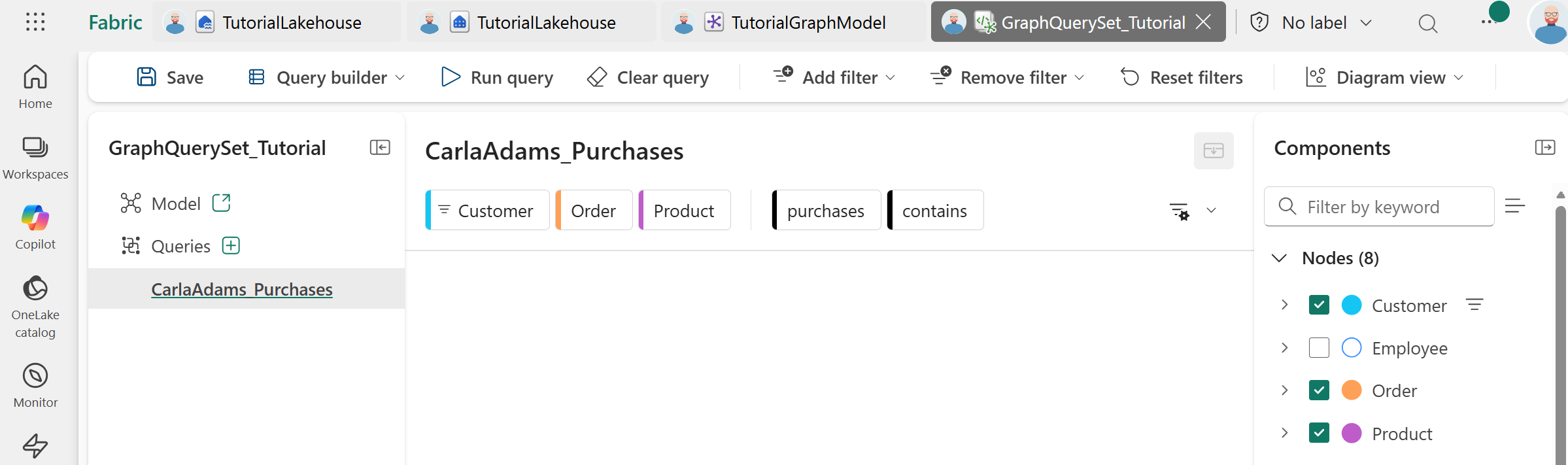 Sélectionnez l’arête achats tout en sélectionnant le nœud Client. Le générateur de requêtes ajoute automatiquement le nœud Order connecté.