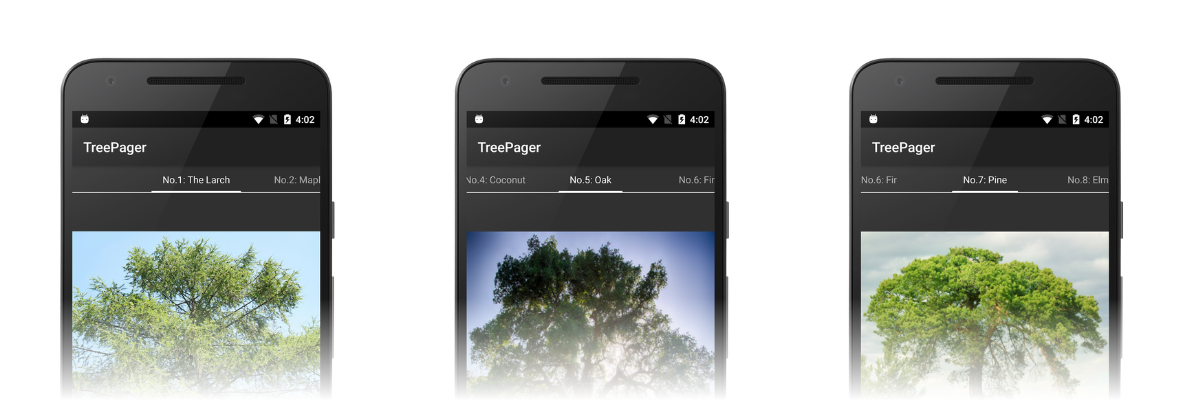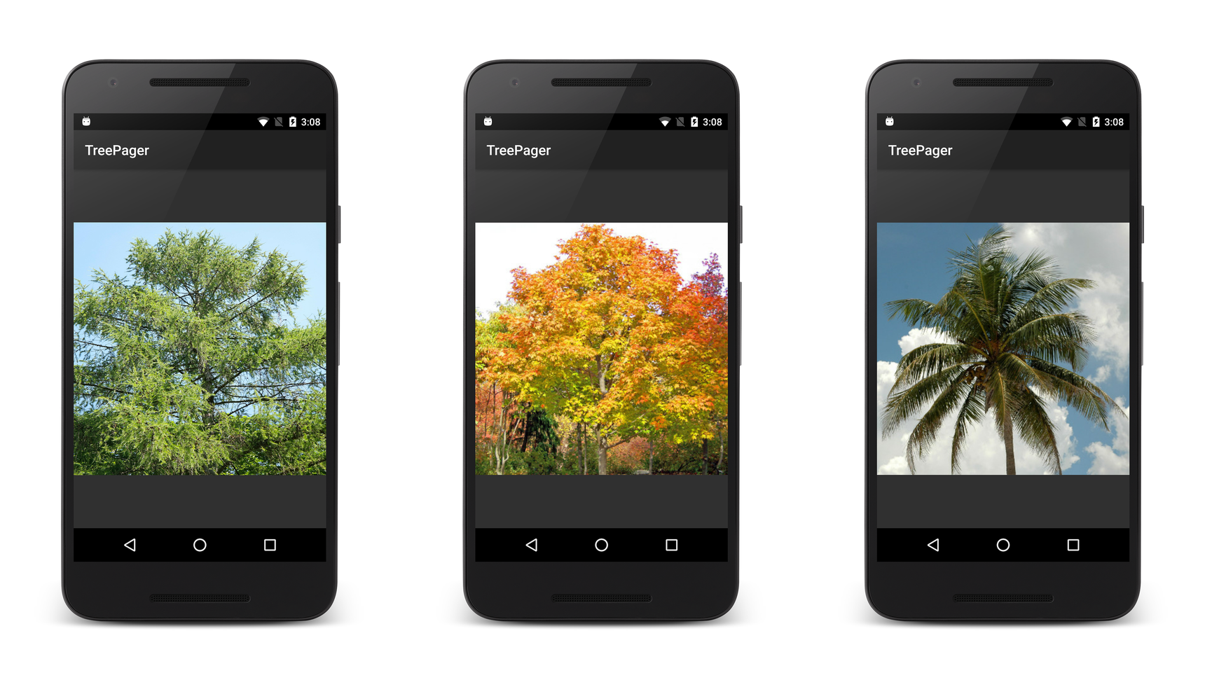 Ce guide est une procédure pas à pas qui fournit une démonstration pas à pas de l’implémentation ViewPager d’une galerie d’images d’arbres caduques et persistants. Dans cette application, l’utilisateur effectue un mouvement de balayage vers la gauche et la droite dans un « catalogue d’arborescences » pour afficher les images d’arborescence. En haut de chaque page du catalogue, le nom de l’arborescence est répertorié dans unPagerTabStrip, et une image de l’arborescence s’affiche dans un ImageView. Un adaptateur est utilisé pour interfacer le ViewPager modèle de données sous-jacent. Cette application implémente un adaptateur dérivé de PagerAdapter.