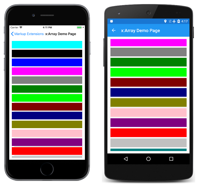 Dans cet exemple, les trois expressions OnPlatform utilisent la version abrégée du nom de classe OnPlatformExtension. Les trois OnPlatform extensions de balisage définissent les Colorpropriétés , WidthRequestet HeightRequest les propriétés des BoxView différentes valeurs sur iOS, Android et UWP. Les extensions de balisage fournissent également des valeurs par défaut pour ces propriétés sur les plateformes qui ne sont pas spécifiées, tout en éliminant la partie Default= de l’expression. Notez que les propriétés d’extension de balisage définies sont séparées par des virgules.