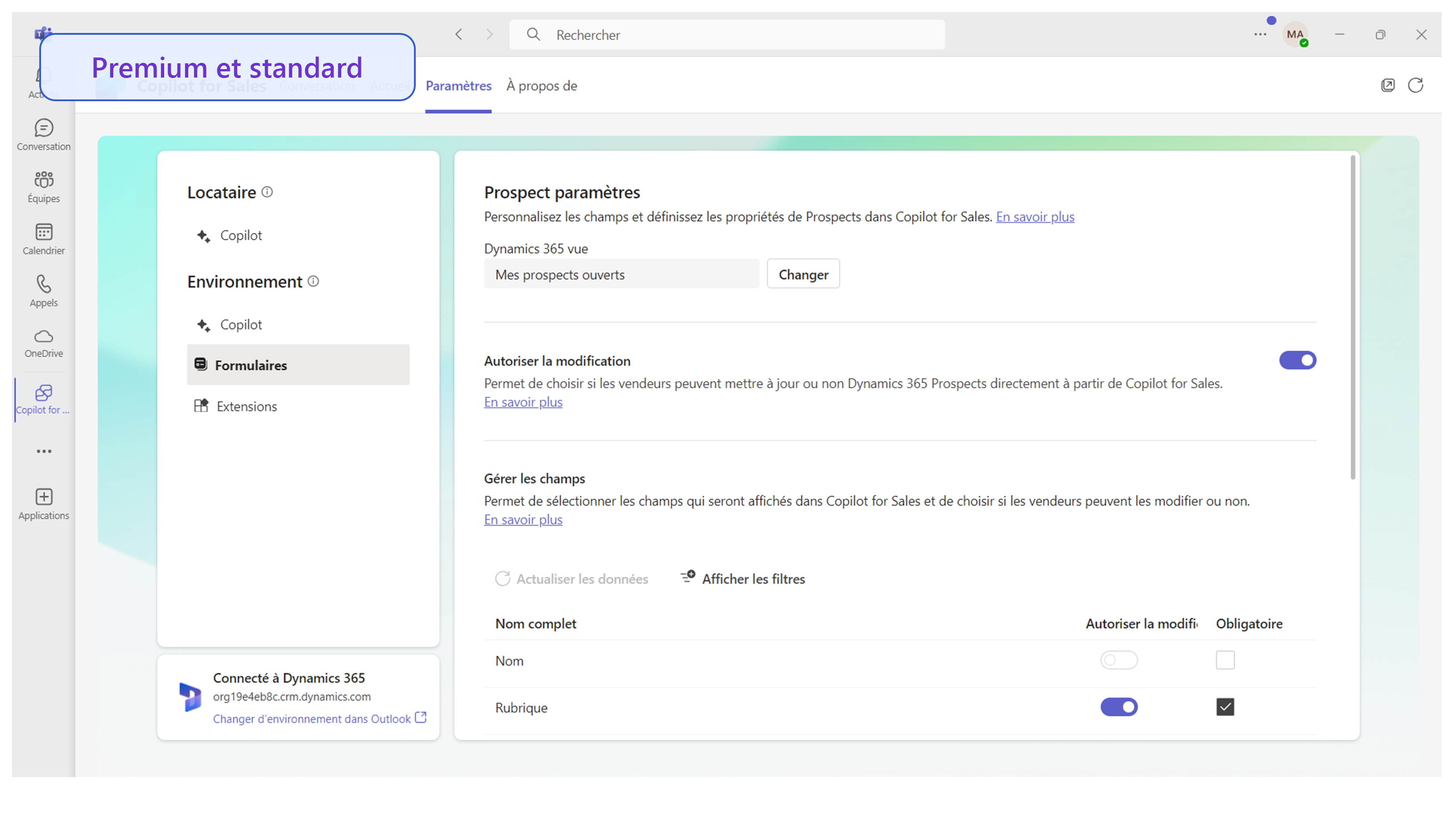 Les ventes dans l'application Microsoft 365 Copilot prennent en charge toutes les entités prêtes à l'emploi et personnalisées pertinentes dans le CRM. Elle permet aux organisations de configurer et de hiérarchiser les enregistrements qui sont importants pour la réussite de leur entreprise. Cela inclut le marquage des enregistrements comme modifiables et des champs comme obligatoires pour garantir la facilité d’accès et la qualité de l’entrée de données. Pour en savoir plus, consultez le guide d’implémentation Personnaliser les formulaires et les champs.