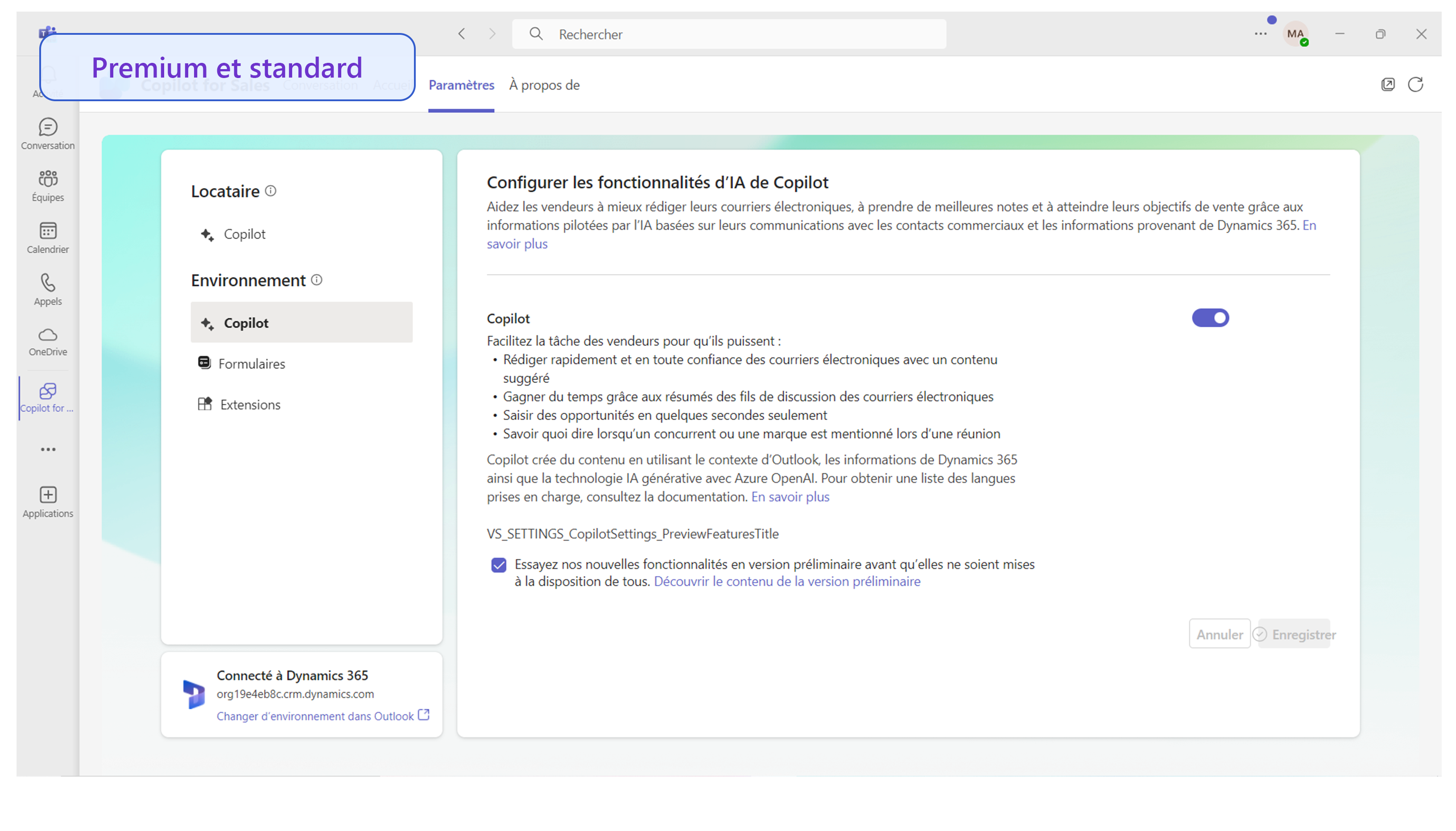De nombreuses organisations commerciales personnalisent leur système CRM pour répondre à leurs besoins métier. Les ventes dans Microsoft 365 Copilot sont préconfigurées pour fonctionner avec les enregistrements de contact, d’opportunité et de compte. L’expérience d’administration permet aux organisations commerciales de définir ce qui leur importe, ce qui permet de s’assurer que leurs équipes commerciales disposent des données CRM nécessaires accessibles à eux.