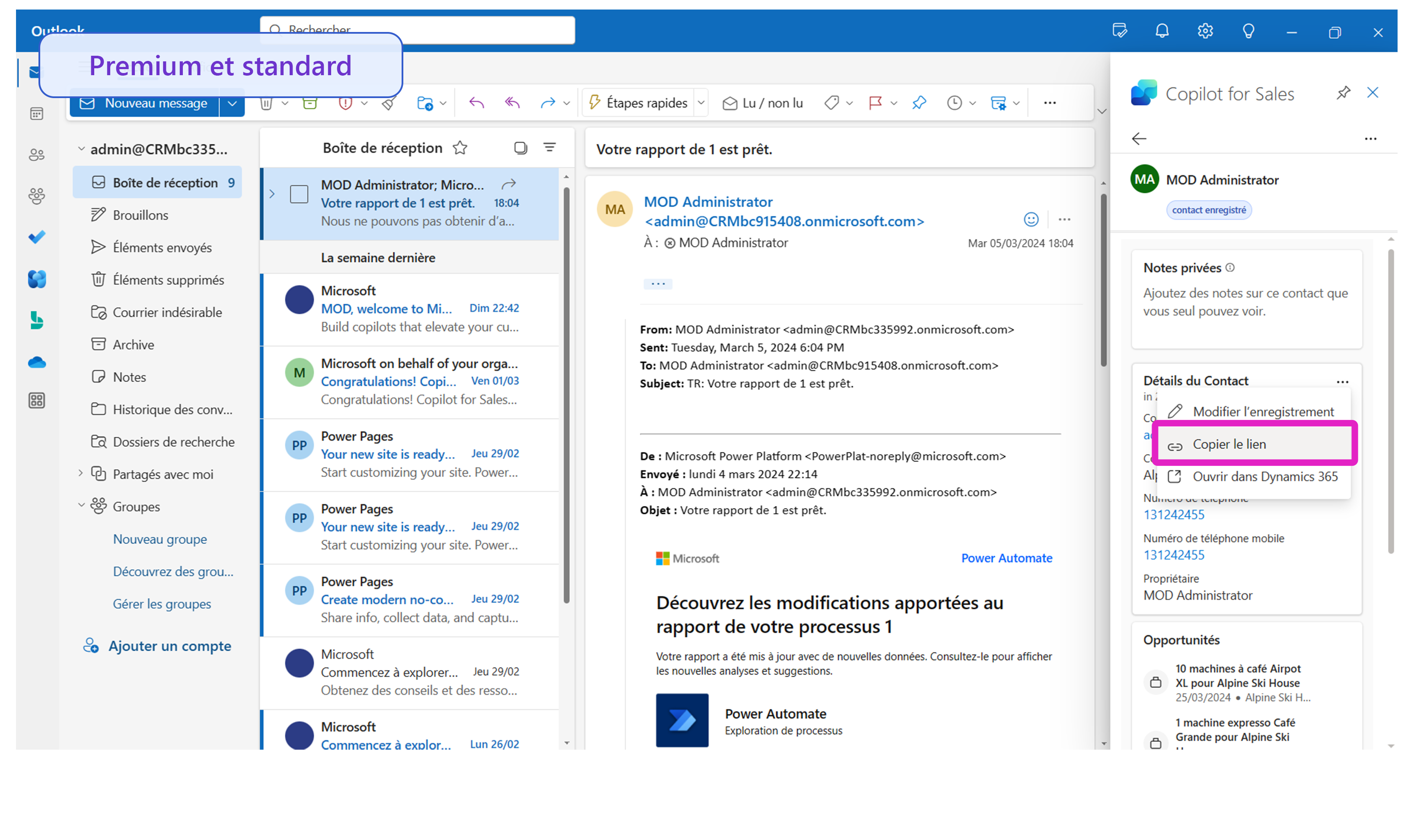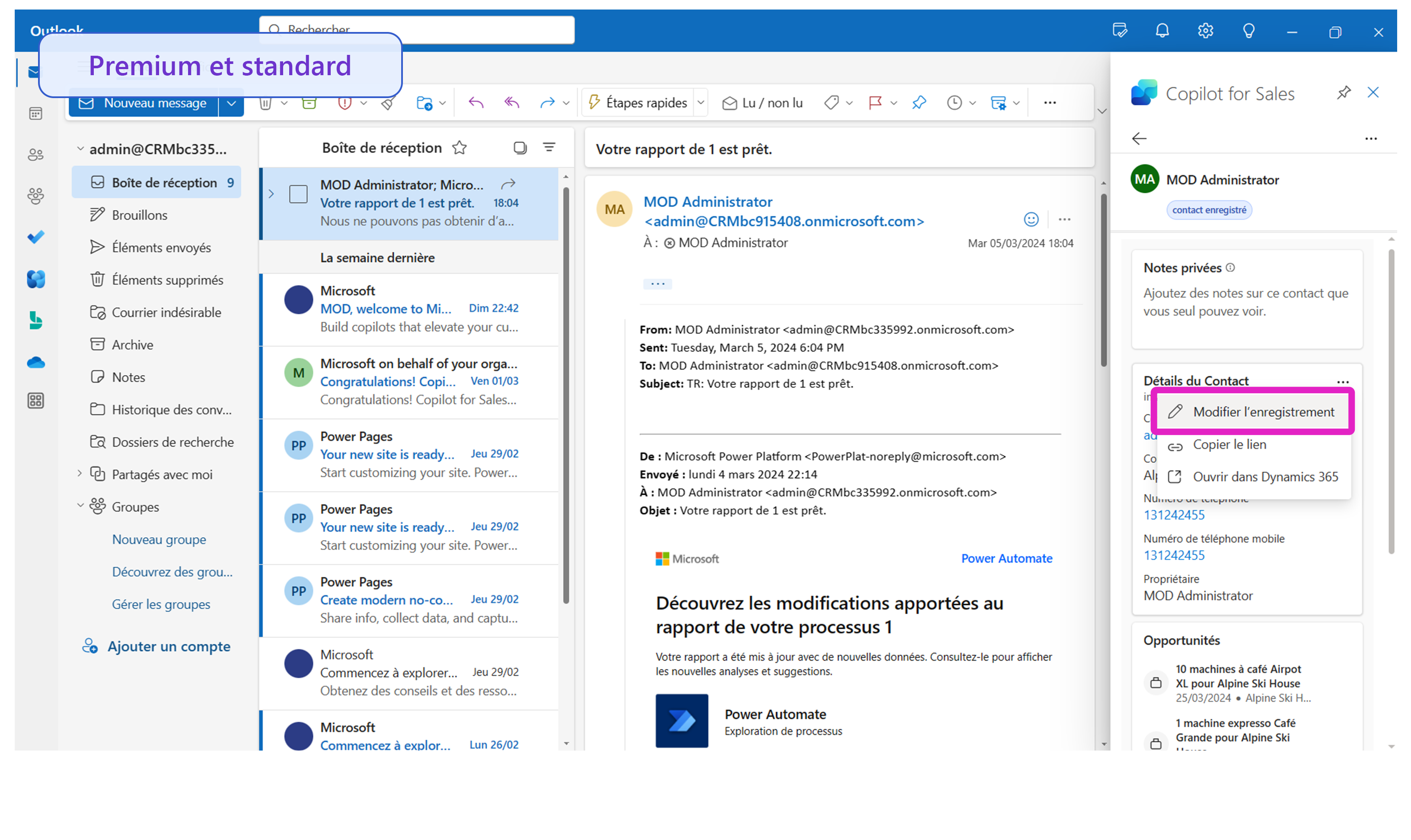 Le contexte est toujours essentiel. Avec Sales in Microsoft 365 Copilot, les contacts, les opportunités et les enregistrements de compte associés sont facilement accessibles. Les mises à jour sont claires et simples ; il vous suffit de cliquer sur le menu des points de suspension (…) sur une carte d’enregistrement et de procéder à la modification dans Outlook.