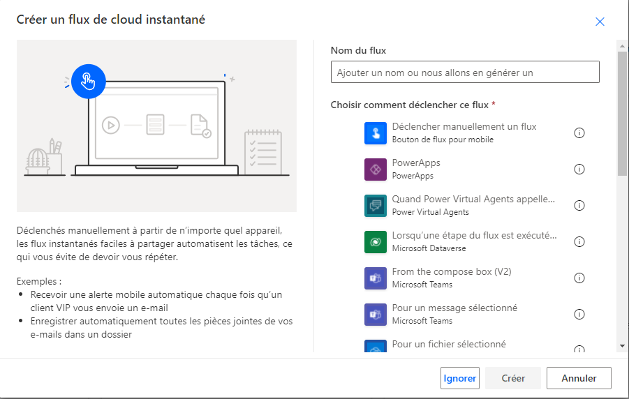 Lorsqu’un flux est partagé en exécution seule, l’utilisateur peut l’exécuter, mais il ne peut pas y apporter de modifications. Le partage en exécution seule n’est disponible que pour les flux de cloud instantanés. Les flux de cloud instantanés sont déclenchés manuellement à partir de l’une des applications prises en charge. L’image suivante montre quelques déclencheurs disponibles qui permettent à un flux de cloud de prendre en charge le partage en exécution seule.