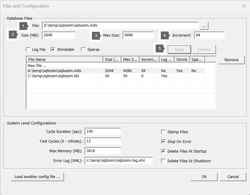 - Utilisez la boîte de dialogue Fichiers et configuration après avoir exécuté le fichier SQLIOSim.exe .