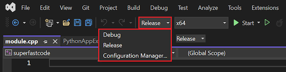 - Pour le projet C++ (superfastcode ou superfastcode2 ), modifiez la configuration cible pour qu’elle corresponde à votre installation python. Par exemple, si votre configuration cible de projet C++ est Win32, mais que votre installation Python est 64 bits, remplacez la configuration cible du projet C++ par x64.