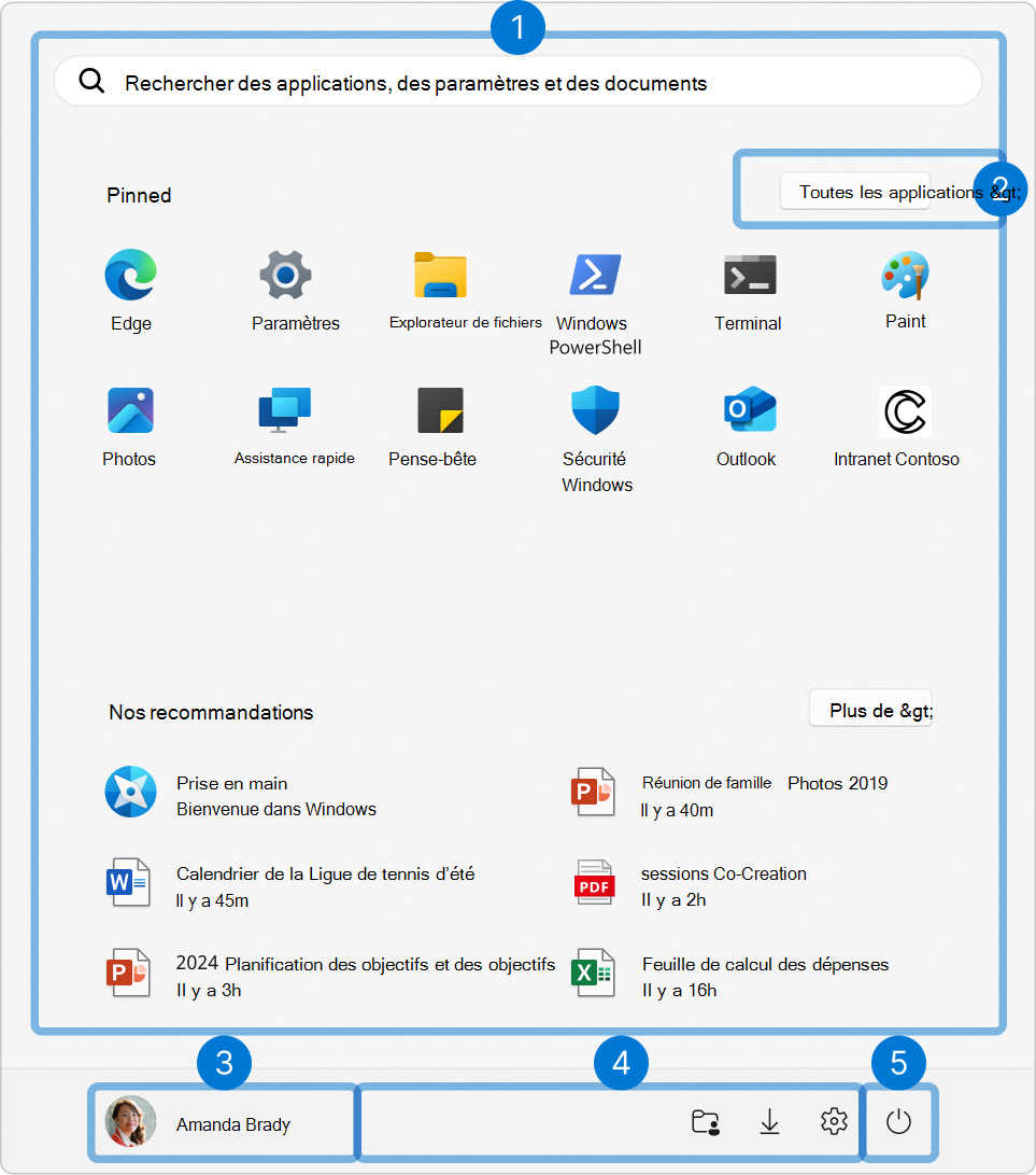 La structure du menu Démarrer se compose de cinq zones principales, que vous pouvez configurer pour répondre aux besoins de votre organization. Ces zones sont les suivantes :