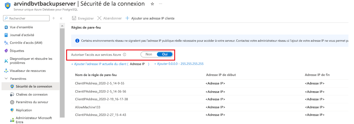 - Serveur Azure Database pour PostgreSQL : réglez Autoriser l’accès aux services Azure surOui.