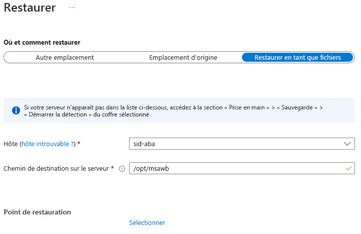 Dans le volet Restauration , sous Où et comment restaurer, sélectionnez Restaurer en tant que fichiers.