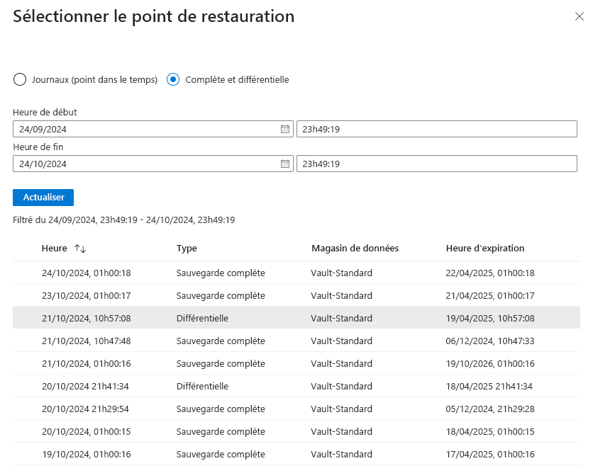 Vous pouvez les restaurer à une date ou à une heure spécifique (à la seconde près) en utilisant les sauvegardes de fichiers journaux. La Sauvegarde Azure détermine automatiquement les sauvegardes complètes, les sauvegardes différentielles et la chaîne des sauvegardes de fichiers journaux qui sont nécessaires pour effectuer la restauration selon la date ou l’heure sélectionnée.
