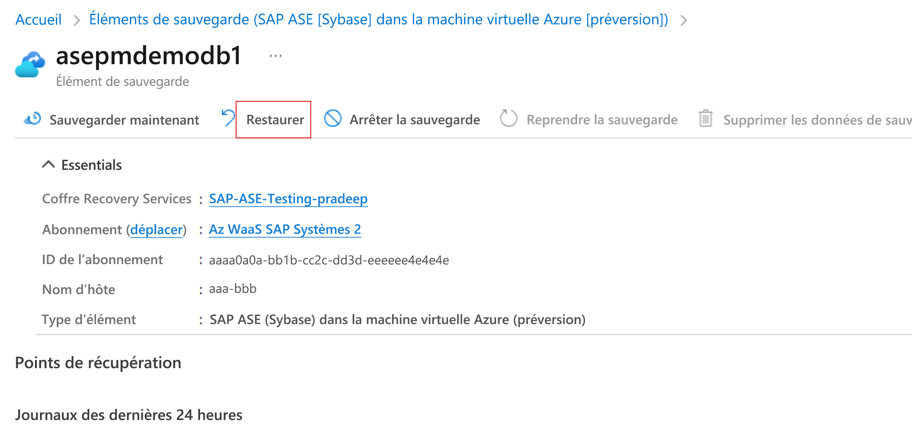 Cet article explique comment restaurer des bases de données SAP ASE (exécutées sur des machines virtuelles Azure) à l’aide du portail Azure. Vous pouvez utiliser les données restaurées pour créer des copies dans le cadre de scénarios de développement et de test, ou pour revenir à un état antérieur.