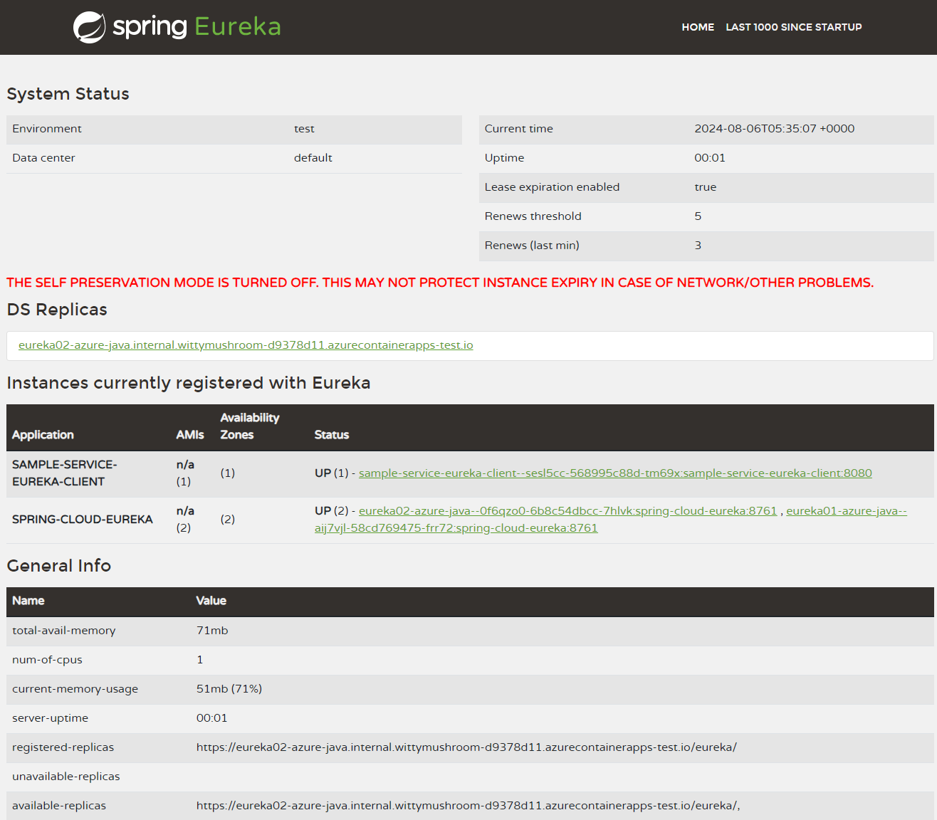 Cette commande retourne l’URL que vous pouvez utiliser pour accéder au tableau de bord Serveur Eureka pour Spring. Dans le tableau de bord, vous pouvez vérifier que la configuration du serveur Eureka se compose de deux réplicas.