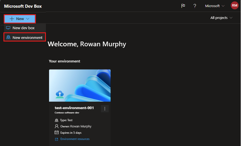 Seuls les utilisateurs disposant du rôle Utilisateur Environnements de déploiement, du rôle Administrateur de projets DevCenter ou d’un rôle intégré disposant des autorisations appropriées pour créer un environnement. Les utilisateurs disposant du rôle Lecteur d’environnements de déploiement peuvent afficher leurs propres environnements et environnements créés par d’autres utilisateurs.