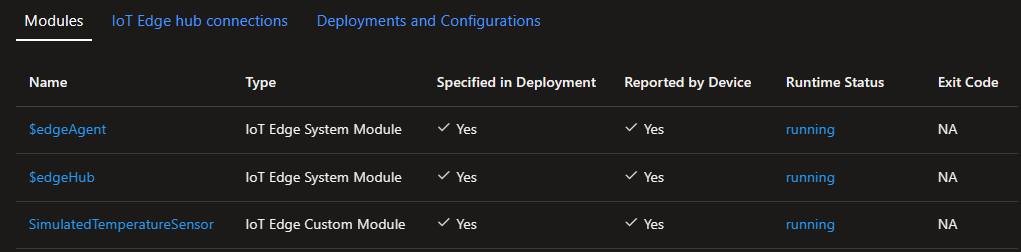 Vous devez voir trois modules : $edgeAgent, $edgeHub et SimulatedTemperatureSensor. Si un ou plusieurs modules ont Yes sous Specified in Deployment mais pas sous Reported by Device, votre appareil IoT Edge les démarre toujours. Attendez quelques minutes, puis actualisez la page.