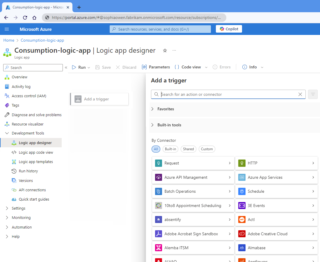 - Shared : connecteurs avec déclencheurs gérés par Microsoft, hébergés et exécutés dans des Azure multilocataire. Ce groupe regroupe les anciens groupes Standard et Entreprise dans les anciennes versions du concepteur.