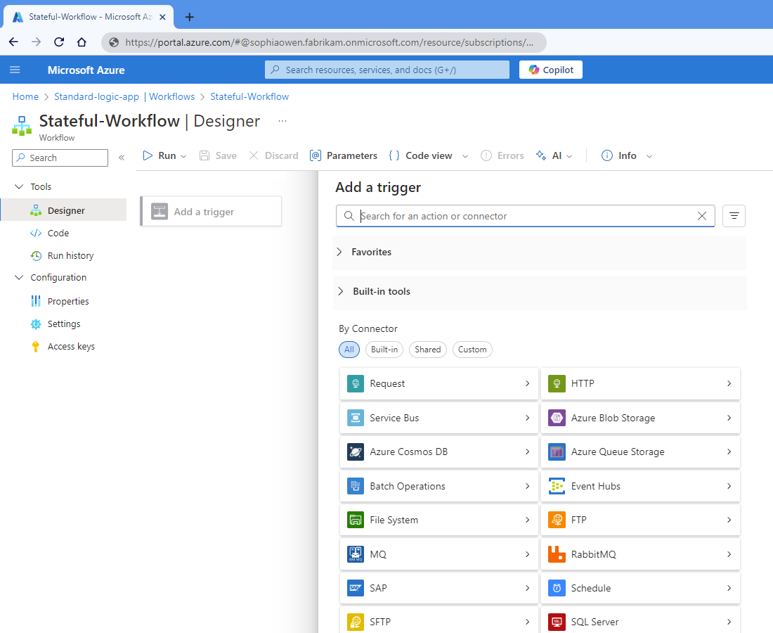 L’exemple de flux de travail Standard suivant montre les collections d’opérations intégrées et les connecteurs lorsque vous ajoutez un déclencheur :