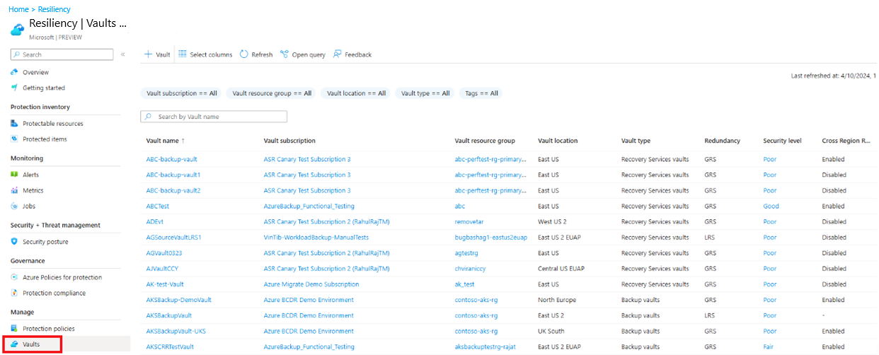 Terminez le flux de travail. Une fois le coffre créé, il apparaît dans la liste des coffres de la section Résilience . S’il n’apparaît pas, sélectionnez Actualiser.
