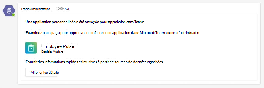 Après avoir configuré la règle d’envoi d’applications, vous pouvez consulter les cartes de notification dans le canal spécifié pour afficher les détails de l’application et sélectionner Afficher les détails pour ouvrir des applications dans le Centre d’administration Teams.