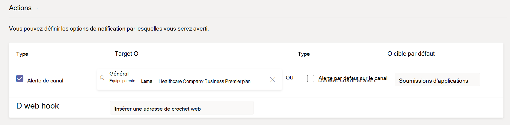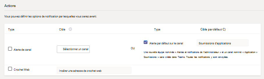 Cochez la case Alerte de canal par défaut pour recevoir des notifications à l’équipe Administration Alertes et notifications dans le canal Soumissions d’applications.