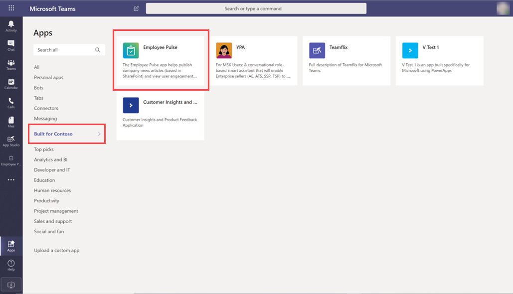 Les utilisateurs disposant d’autorisations sur l’application peuvent la trouver dans l’App Store de votre organization. Dans le client Teams, dans la page Applications, ces applications sont disponibles dans la section Créées pour votre organisation .