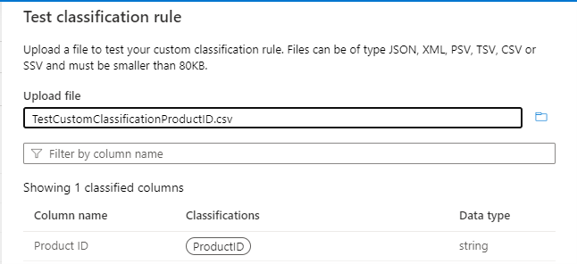 Utilisez la règle de classification de test et testez avec des exemples de données pour vérifier que la règle de classification fonctionne comme prévu. Vérifiez que dans les exemples de données (par exemple, dans un fichier .csv) au moins trois colonnes sont présentes, y compris la colonne sur laquelle la classification doit être appliquée. Si le test réussit, vous devez voir l’étiquette de classification sur la colonne, comme illustré dans l’image suivante :
