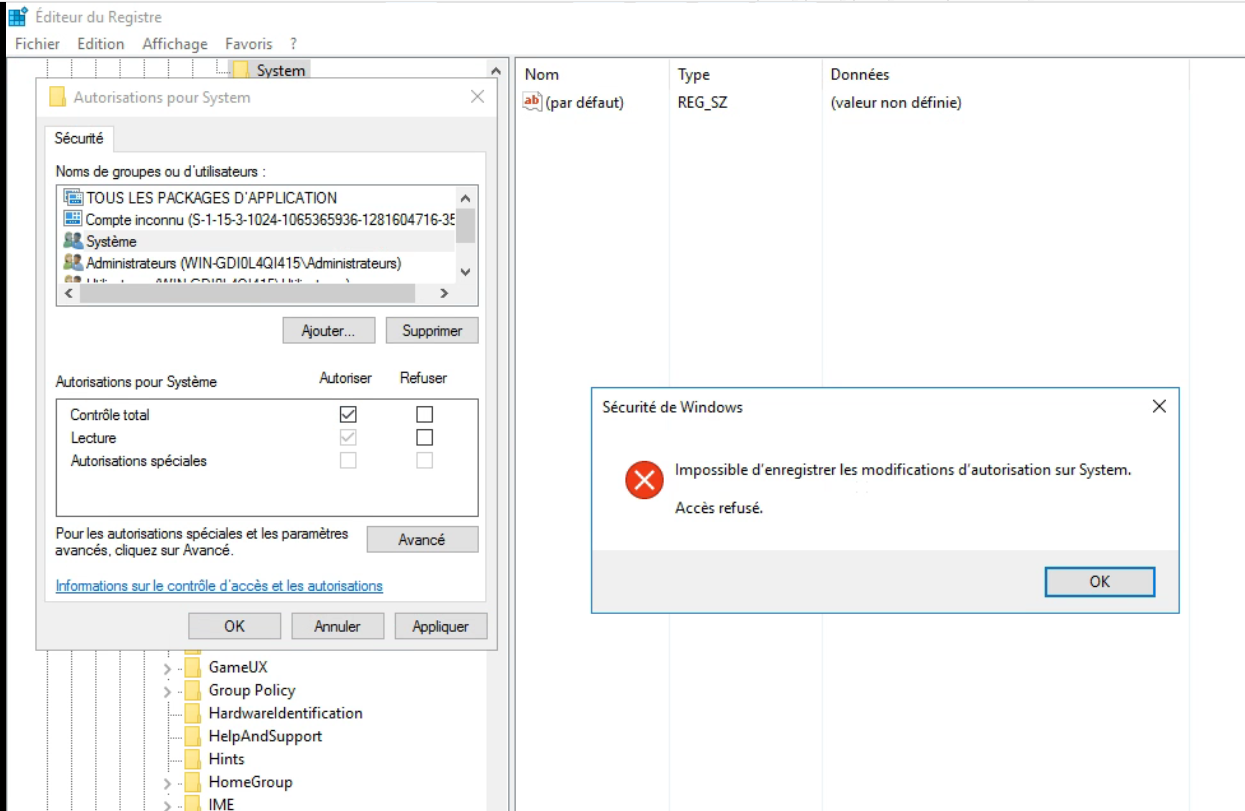 Pour l’autorisation sur le registre, vous pouvez essayer de vérifier si votre compte administrateur dispose d’une autorisation de contrôle total. S’il n’y a pas d’autorisation ou pas d’autorisations complètes sur le registre spécifique, vous pouvez essayer d’ajouter les autorisations complètes.
