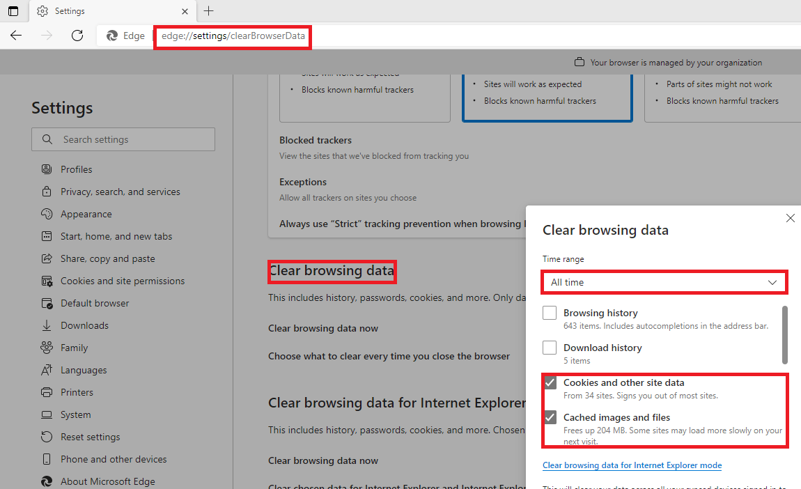 You can then clean out some of your browser data to see if that helps**,** which can be done by going to the page: edge://settings/clearBrowserData
