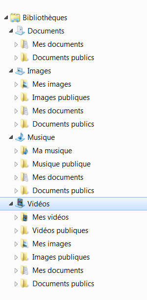 Ce qui me gêne c'est d'avoir une arborescence dans les bibliothèques avec les dossiers Mes documents et Documents publics affiché dans toutes le bibliothèques, alors qu'il, me semble-t-il, ne devrait s'afficher que dans Documents.