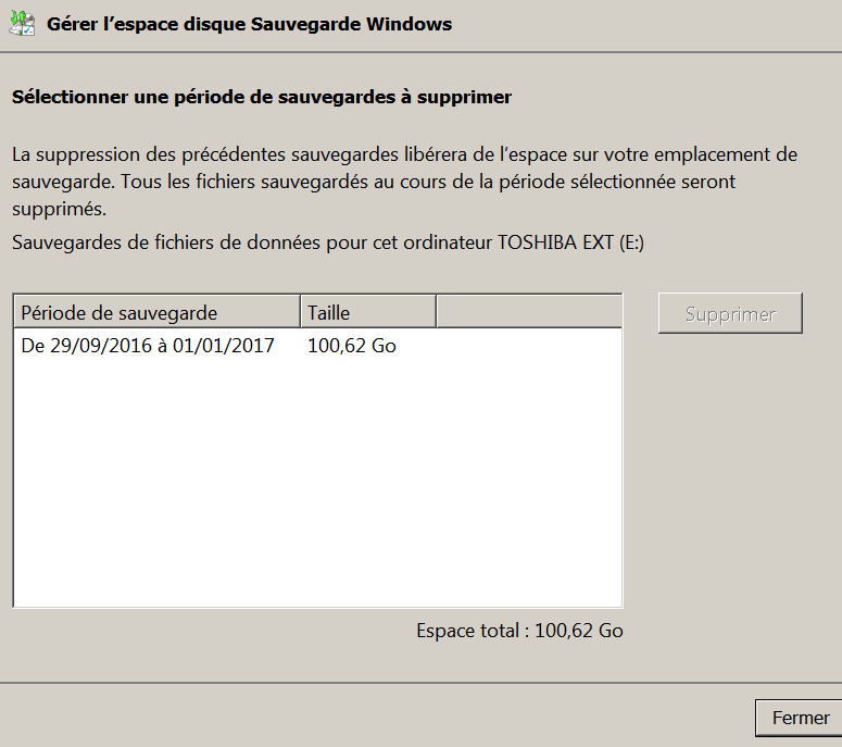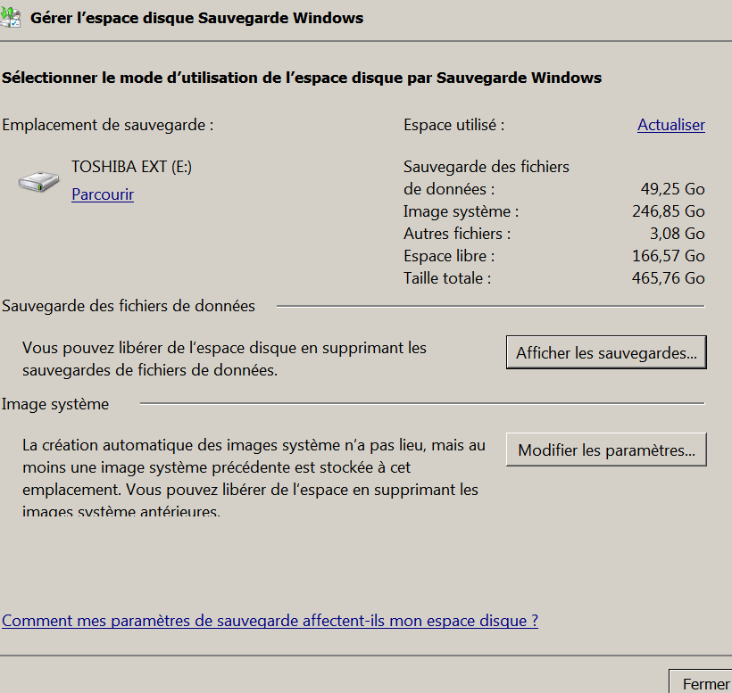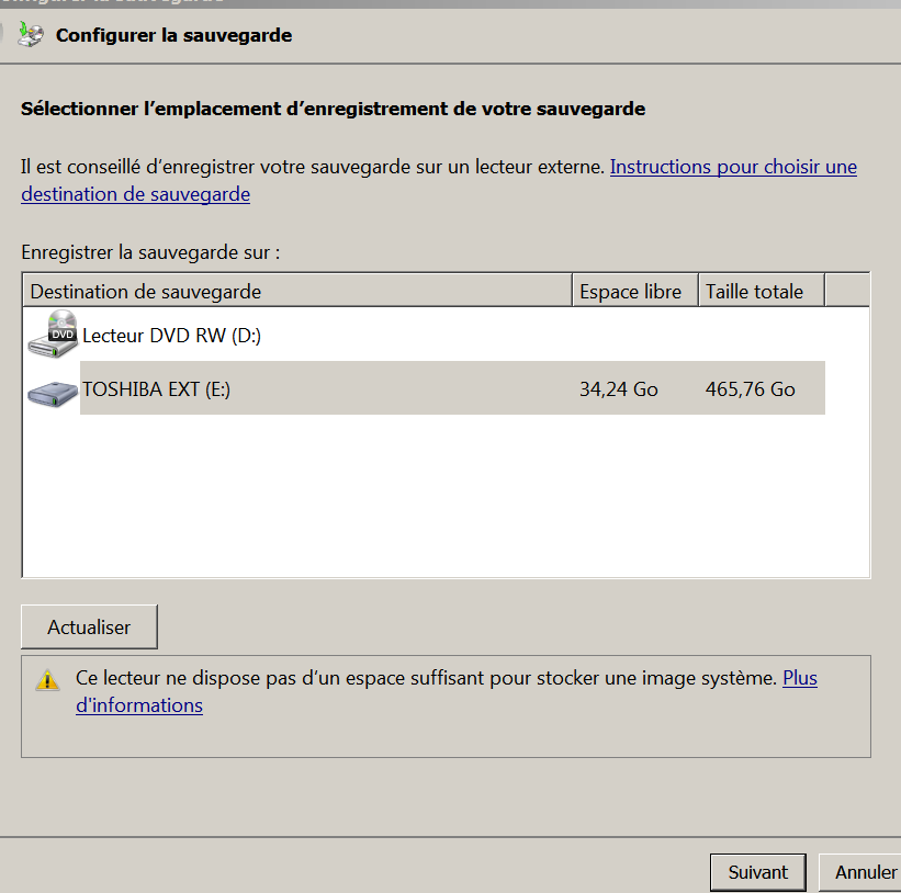 Veuillez nous excuser pour le délai de réponse. Avez-vous solutionné votre problème depuis? Si je me réfère aux captures d'écran que vous données - et dans l'hypothèse où l'outil de sauvegarde n'est pas corrompu - votre disque dur externe ne dispose pas d'assez de place libre pour finaliser la sauvegarde dans son intégralité.