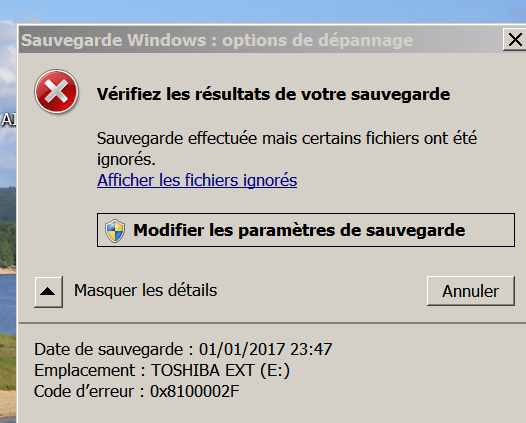 Je vous propose en complément la lecture d'un article spécifiquement créé pour les problèmes de sauvegarde sous Windows 7 qui rencontrent le code d'erreur 0x8100002F. Il vous donne des informations qui peuvent s'avérer utiles, répertorie les causes connues et les solutions qui leur sont offertes. Cliquez ici pour ouvrir la page. Si vous le nécessitez vous pouvez aussi consulter la page explicative du processus de sauvegarde sur ce lien.