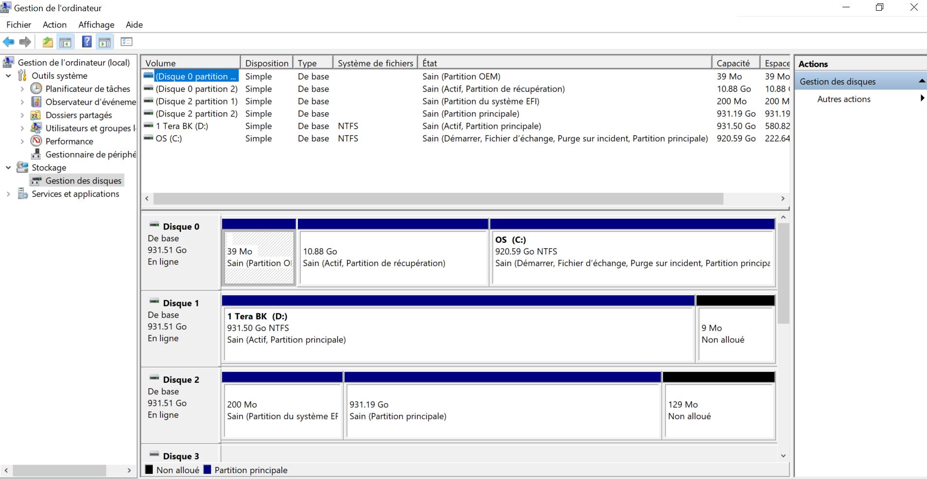 Dans la Gestion de disque il est VU en disque 2 mais aucune lettre ne lui est attribué. De plus il est inscrit sur une partition: Partition principale saine de 931.19 Go, sur la deuxième partition il est inscrit 200 Mo partition saine et 129Mo n'est pas alloué