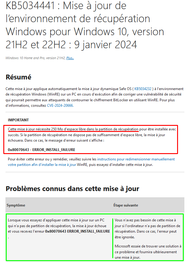 Sur le sujet de la mise à jour KB5034441 et de l'erreur 0x80070643.