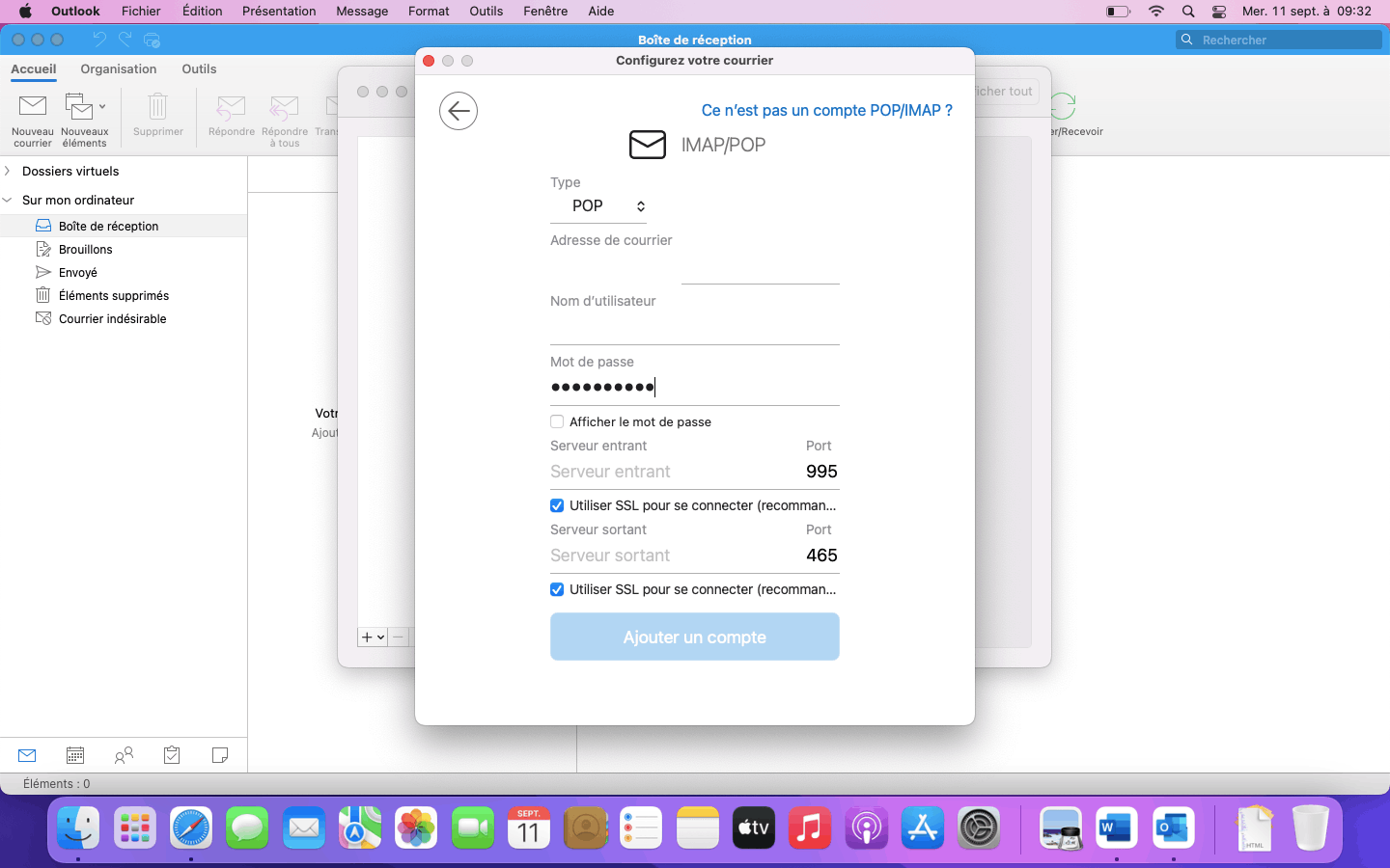 Les comptes @outlook.com ne se paramètrent plus en POP (ce n'est plus en conformité avec les contraintes de sécurité de Microsoft). De toute façon, lorsque tu passes par le menu "Outils" > "Comptes...", dans la fenêtre de création d'un nouveau compte dès que tu rentres l'adresse en @outlook.com c'est un "Compte Microsoft" qui est proposé et il est paramétré automatiquement dès la saisie du mot de passe...