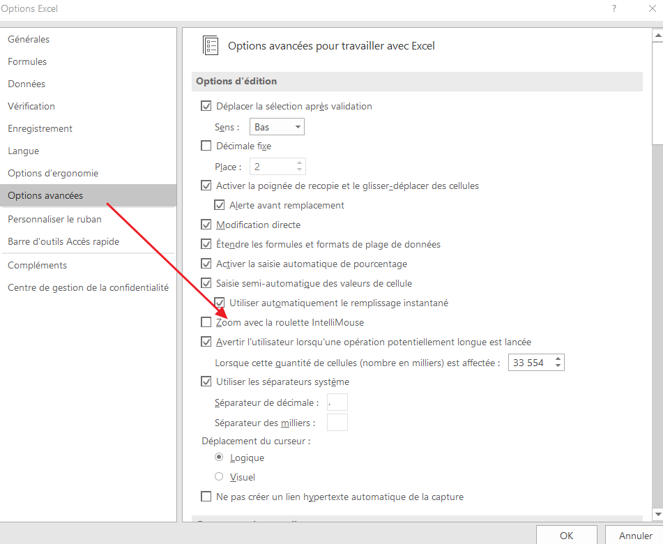 sous excel : la molette agit sur la taille du contenu du dossier ouvert, au lieu de monter ou descendre de ligne.