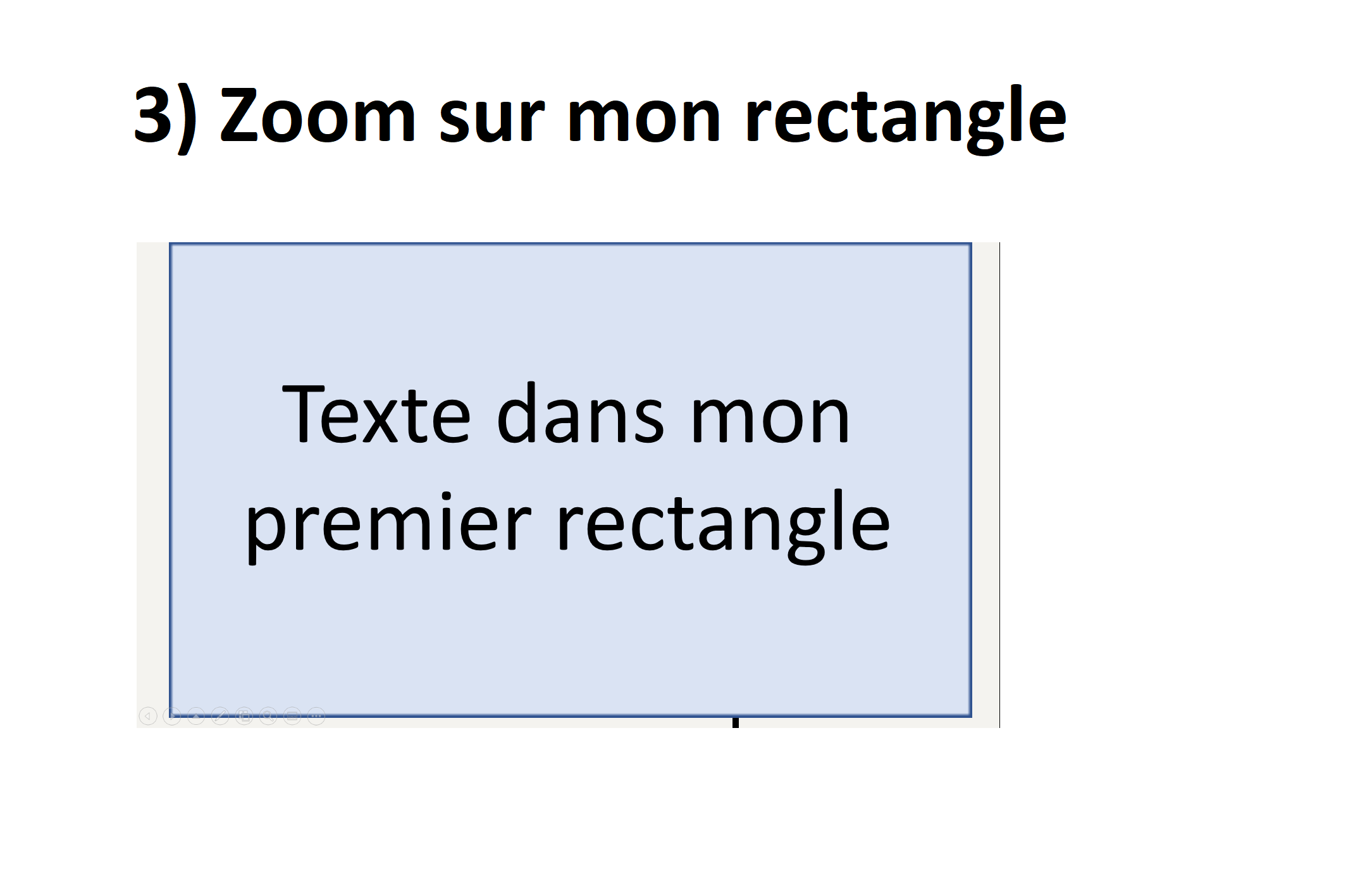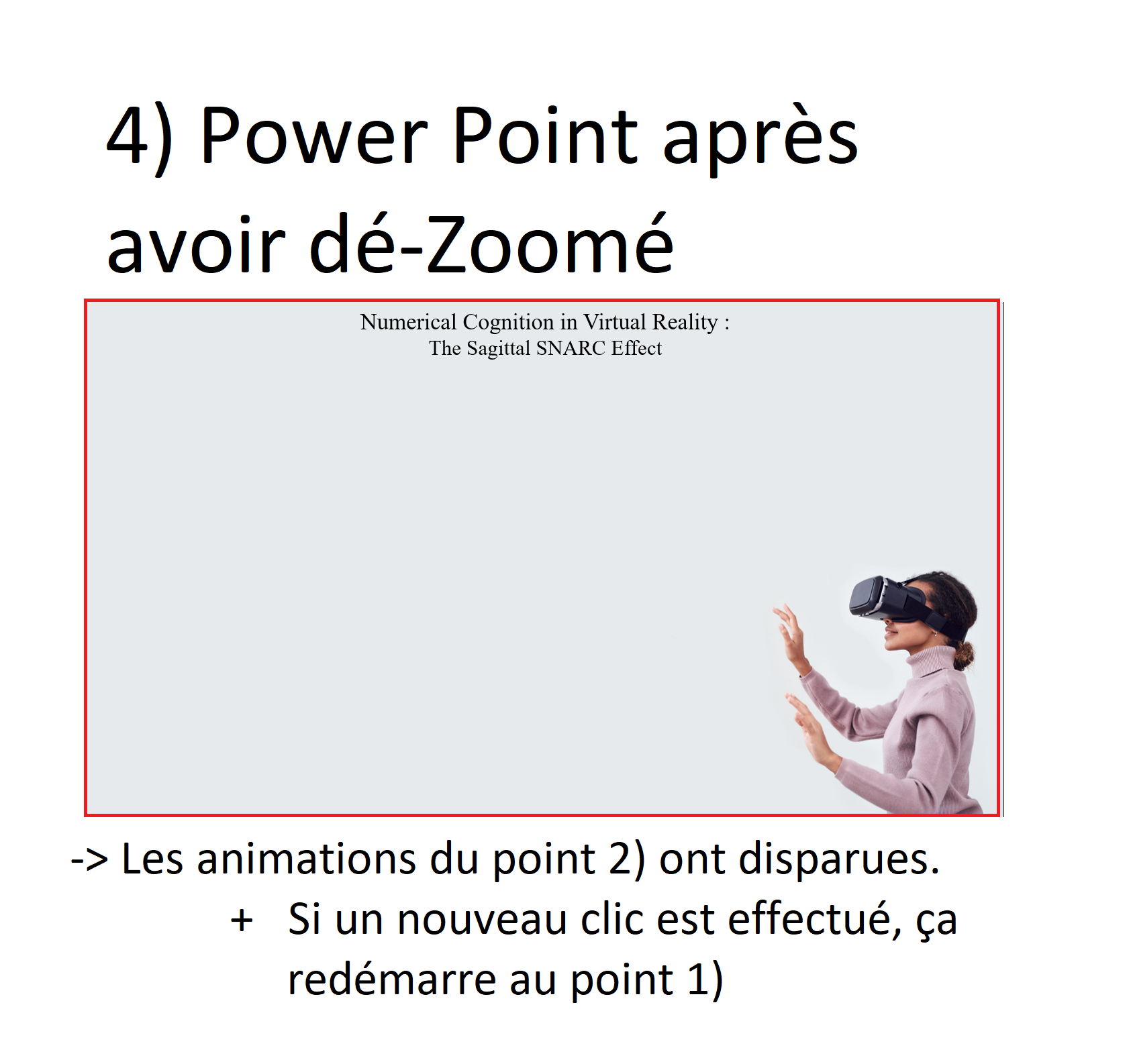 Ce qu'il se passe: Je Zoom sur le rectangle pour voir le texte qui y est affiché [Image 3)]. Quand je clique, je retourne à mon power point MAIS la ligne qui mène jusqu'au rectangle a disparu [Image 4)]! Et si je clique à nouveau, plutôt que lancer l'animation suivante (une autre ligne, avec un autre rectangle contenant du texte), ça me relance la première étape [Image 2)].