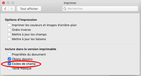 Pour ce qui concerne l'affichage des codes de champ dans l'aperçu avant impression (et dans l'impression), c'est cette fois dans l'onglet "Impression" des préférences qu'il faut aller décocher la case idoine :