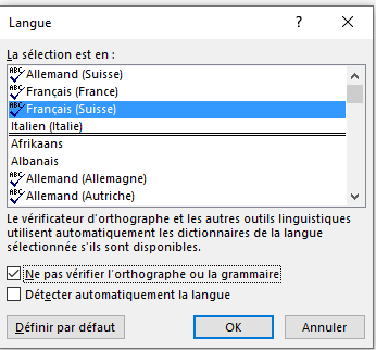 Ce paramètre « ne pas vérifier », comme la langue de vérification, est défini par caractère individuel, et non par le mot, le paragraphe, le document ou l’application Word.