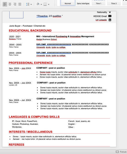 Sinon, qu'observes-tu lorsque tu demandes un aperçu d'impression (menu "Fichier" > "Imprimer..." > "PDF" > "Ouvrir dans Aperçu" (ou à l'impression du document) ? Quel est le format de papier sélectionné (menu "Fichier" > "Mise en page") ?