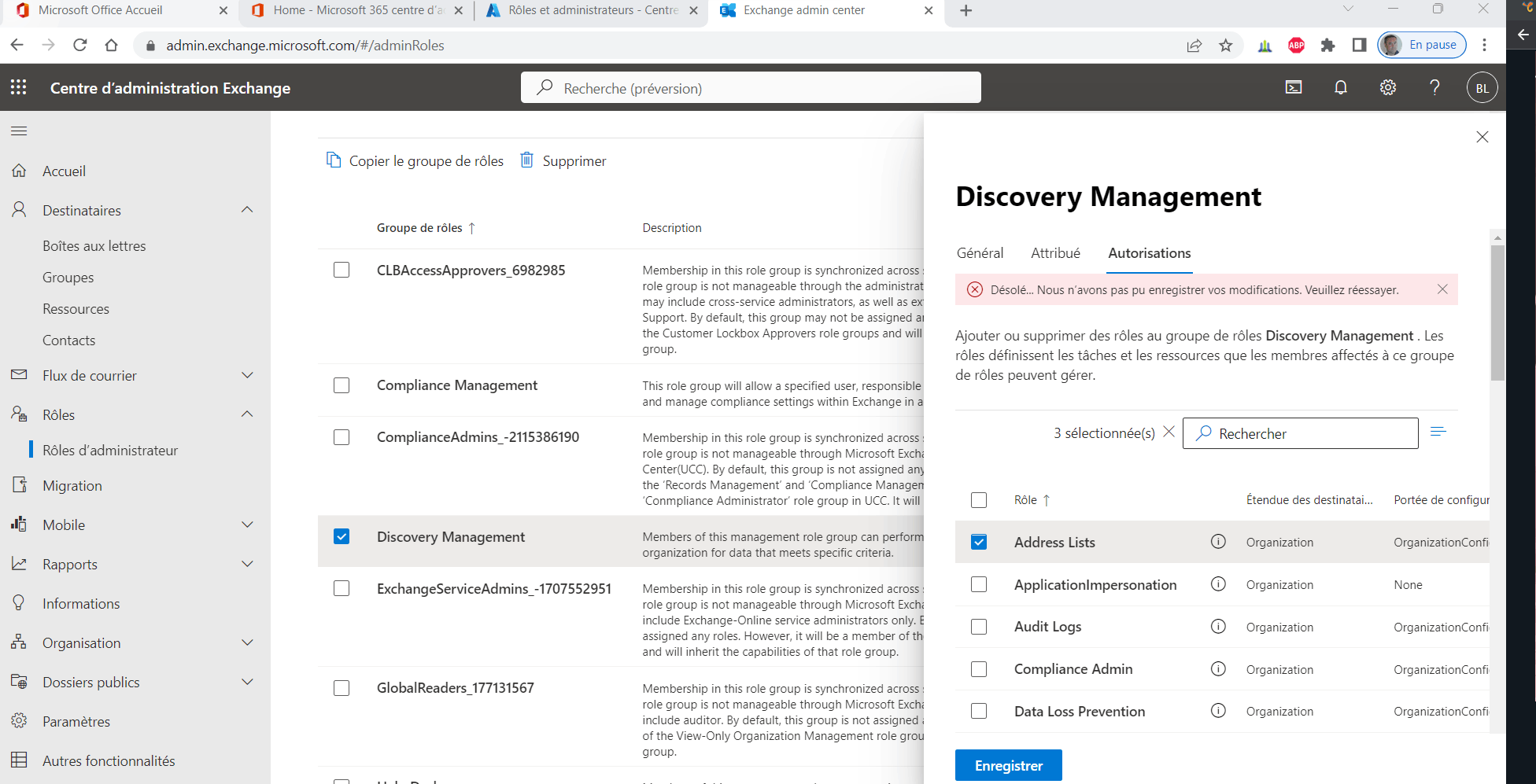 Bonjour, Pour pouvoir exécuter des recherches dans les boites aux lettres, il vous faut des autorisations administrateur supplémentaires.Un administrateur général office 365 doit vous attribuer ces autorisations, depuis le centre d’administration exchange, rôles, rôles administrateurs, puis rajouter votre administrateur dans les rôles {Compliance management, et Discovery management}.L'application des rôles peut allez jusqu’à 48 heures, après l’attribution des droits.En espèrent avoir pu vous venir en aide.Cordialement,BorisMicrosoft Engineer