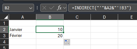 INDIRECT( A2&" ! B3 " ) <=> INDIRECT( "Janvier!B3")