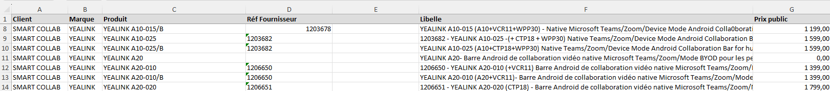 J'ai fait une RechercheX dans un onglet qui fait référence à cette colonne D, et qui recherche la référence fournisseur afin de faire apparaitre le prix public. Je rencontre un problème car ma formule RechercheX ne fonctionne pas avec ce fichier :