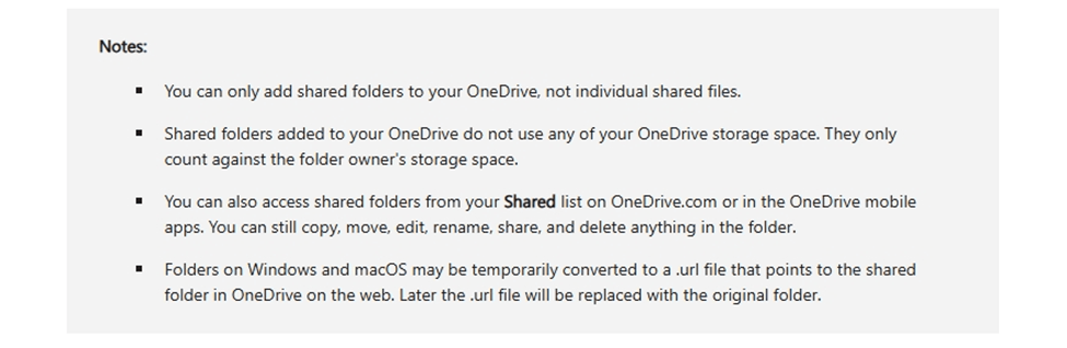 - Visibilité des dossiers partagés : les utilisateurs peuvent voir les dossiers partagés dans un navigateur Web, mais ces dossiers apparaissent sous forme de fichiers de lien (. URL) dans l’Explorateur de fichiers, qui ouvrent le site web OneDrive plutôt que d’afficher le contenu du dossier.