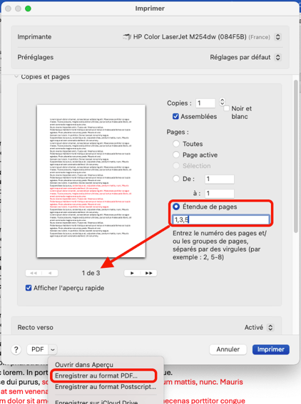 Pour conserver la numérotation d'origine, la solution passe par la création d'un PDF. Dans le dialogue d'impression, on peut indiquer les pages qu'on veut imprimer (champ "Étendue de pages") puis en passant par le menu déroulant "PDF" demander à "Enregistrer au format PDF..." (voire Postscript, à tester avec l'imprimeur) :