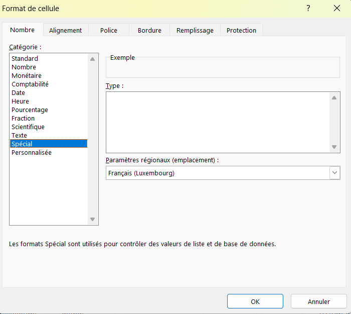 Lorsque je veux formater un texte sous forme de numéro, normalement on peut passer par l'option spécial.