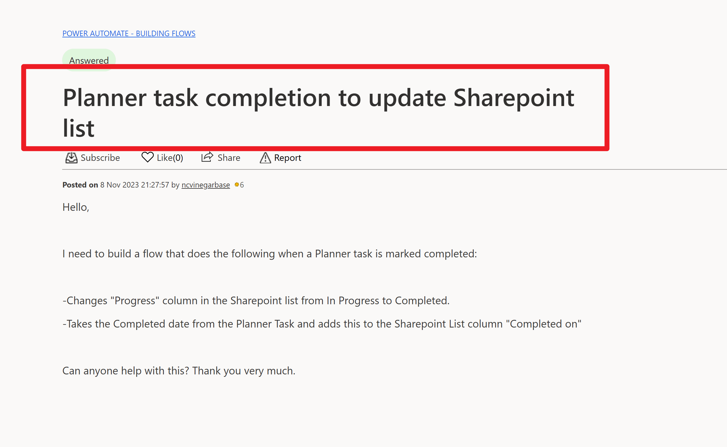 De plus, j’ai trouvé des discussions similaires dans la communauté Power Automate qui pourraient être utiles. Vous pouvez les consulter ici : [Insérer le lien ici ---- >>> résolu : Achèvement de la tâche du planificateur pour mettre à jour la liste Sharepoint