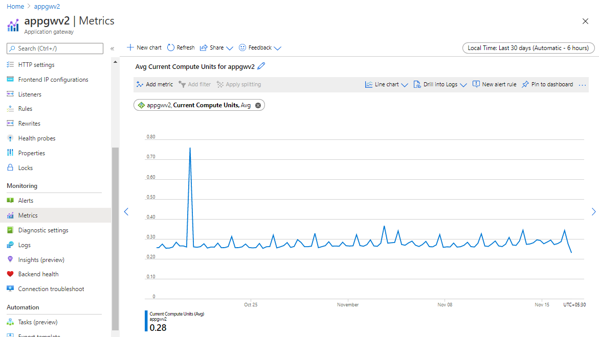 Vérifiez la métrique de votre unité de calcul pour le mois passé. La métrique d’unité de calcul est une représentation de l’utilisation du processeur de votre passerelle, en fonction de votre utilisation maximale, divisée par 10. Vous pouvez définir le nombre d’instances nécessaires, car une instance Application Gateway peut gérer un minimum de 10 unités de calcul