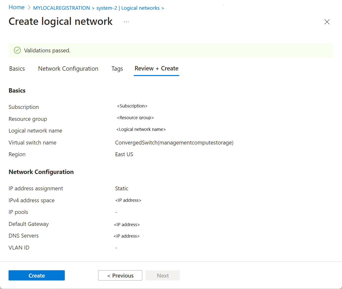 $lnetName = "mylocal-lnet-static" $vmSwitchName = '"ConvergedSwitch(management_compute_storage)"' $subscription = "<Subscription ID>" $resource_group = "mylocal-rg" $customLocationName = "mylocal-cl" $customLocationID ="/subscriptions/$subscription/resourceGroups/$resource_group/providers/Microsoft.ExtendedLocation/customLocations/$customLocationName" $location = "eastus" $addressPrefixes = "100.68.180.0/28" $gateway = "192.168.200.1" $dnsServers = "192.168.200.222" $vlan = "201"Remarque